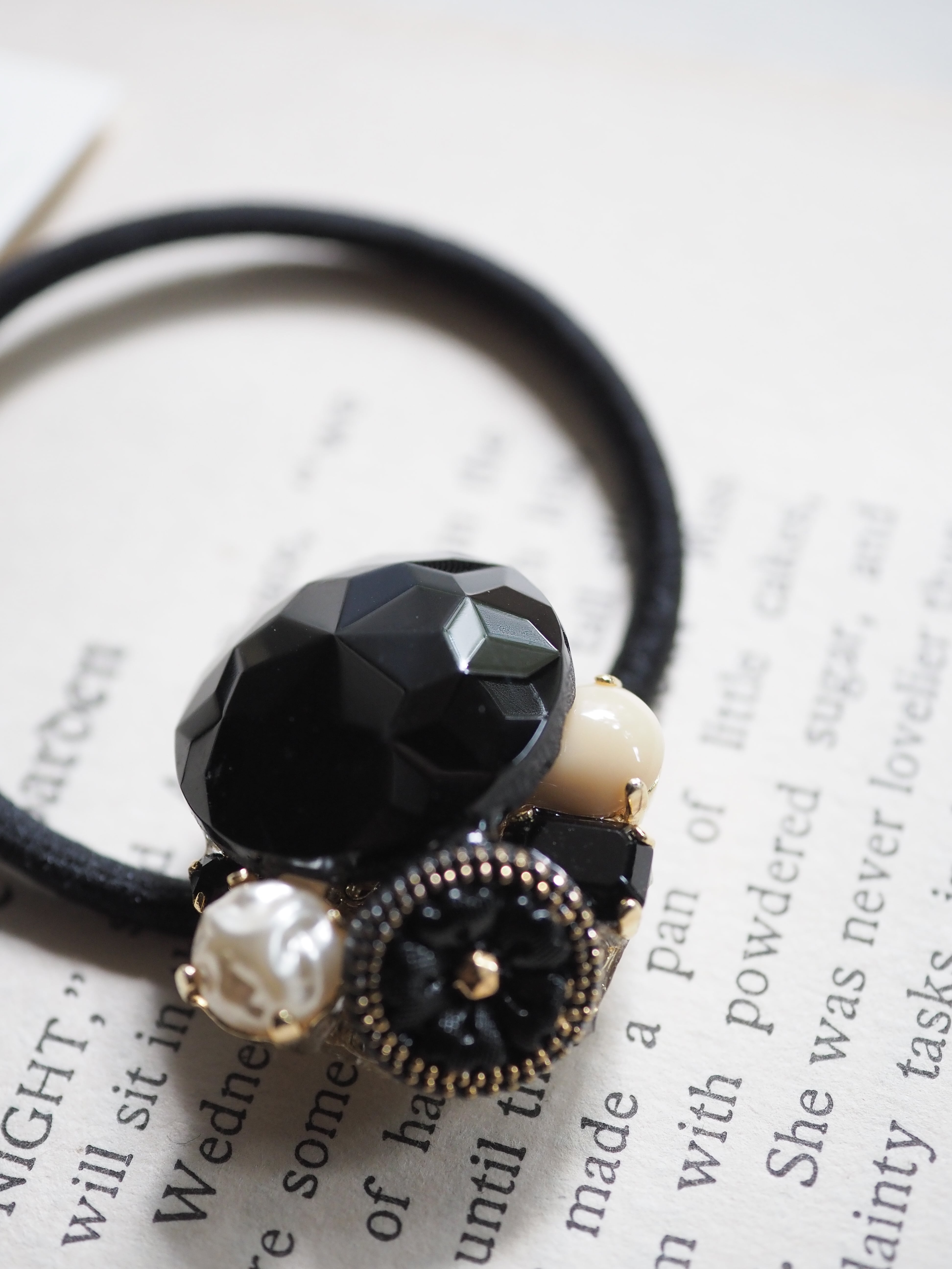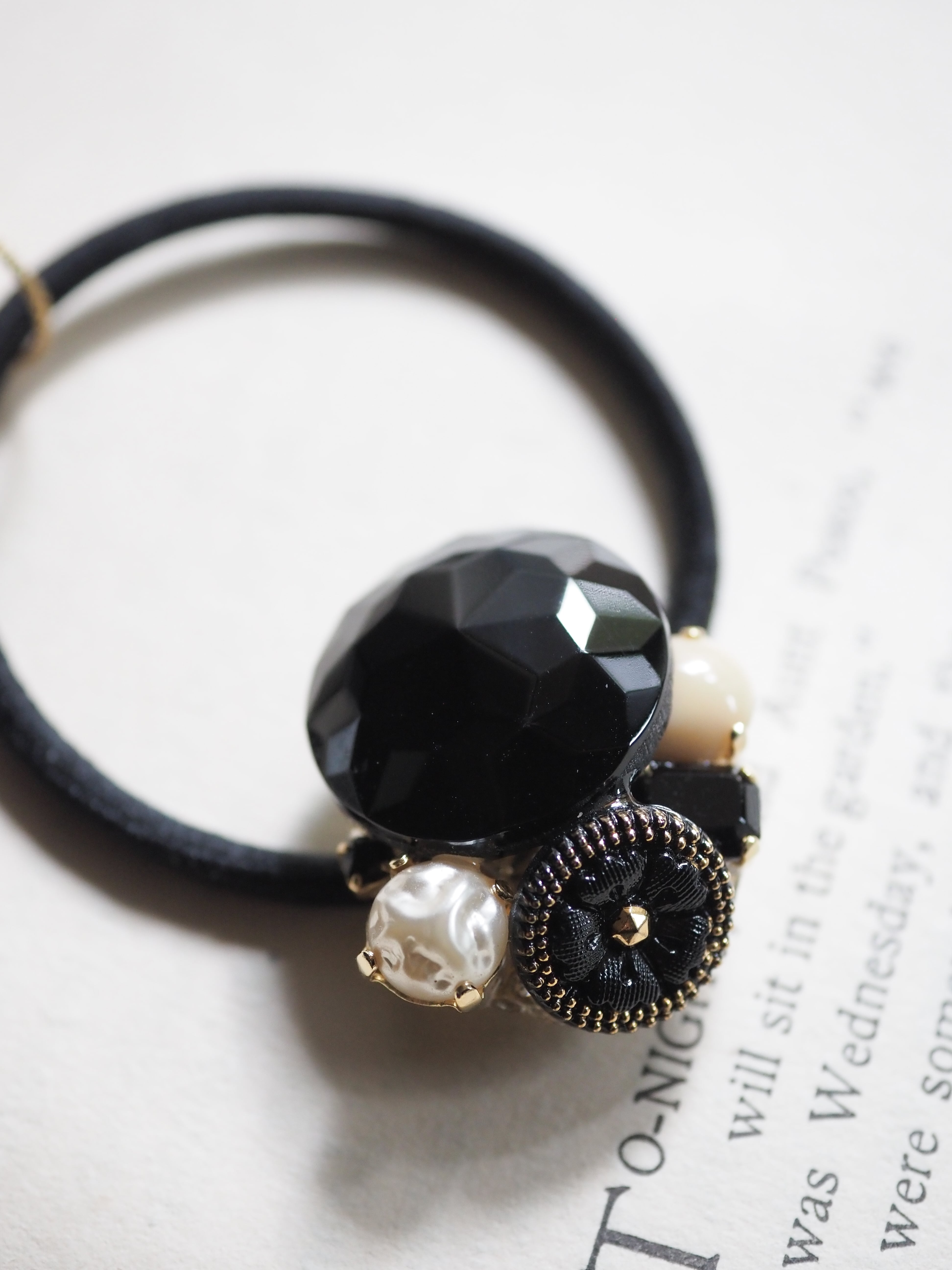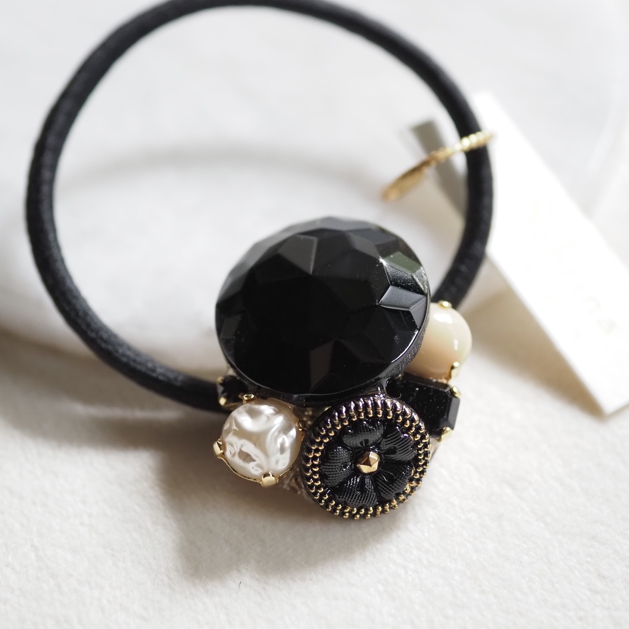控えめに艶めくベージュストーンを添えたヘアゴムです。