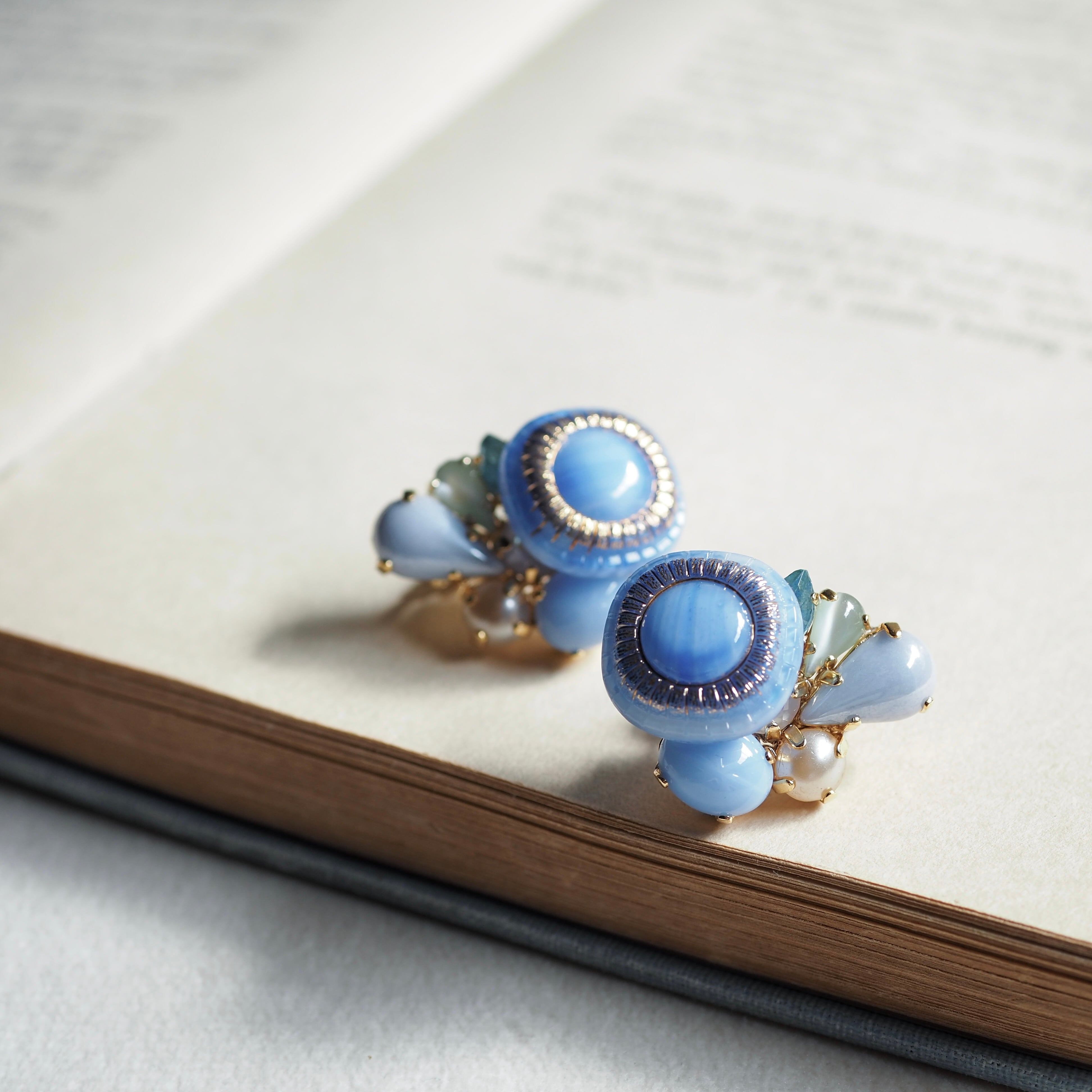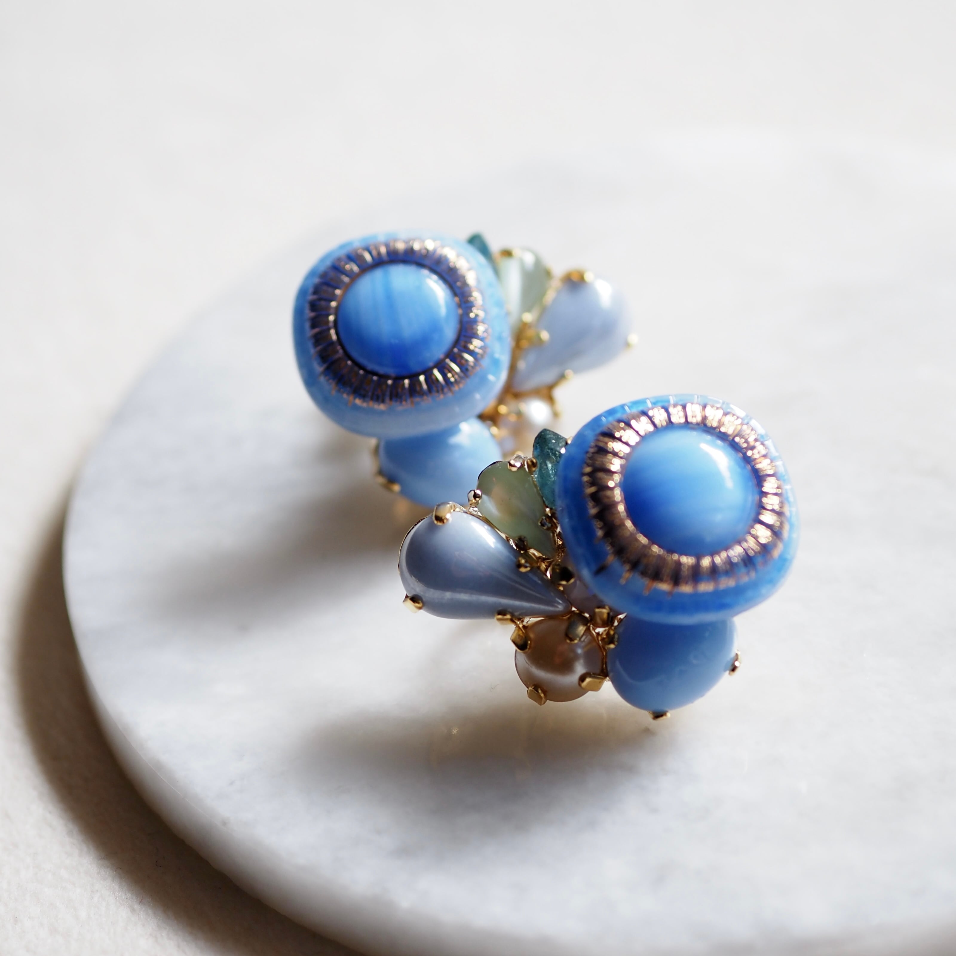 ドイツのヴィンテージガラスボタンを主役に仕立てた耳飾りです。