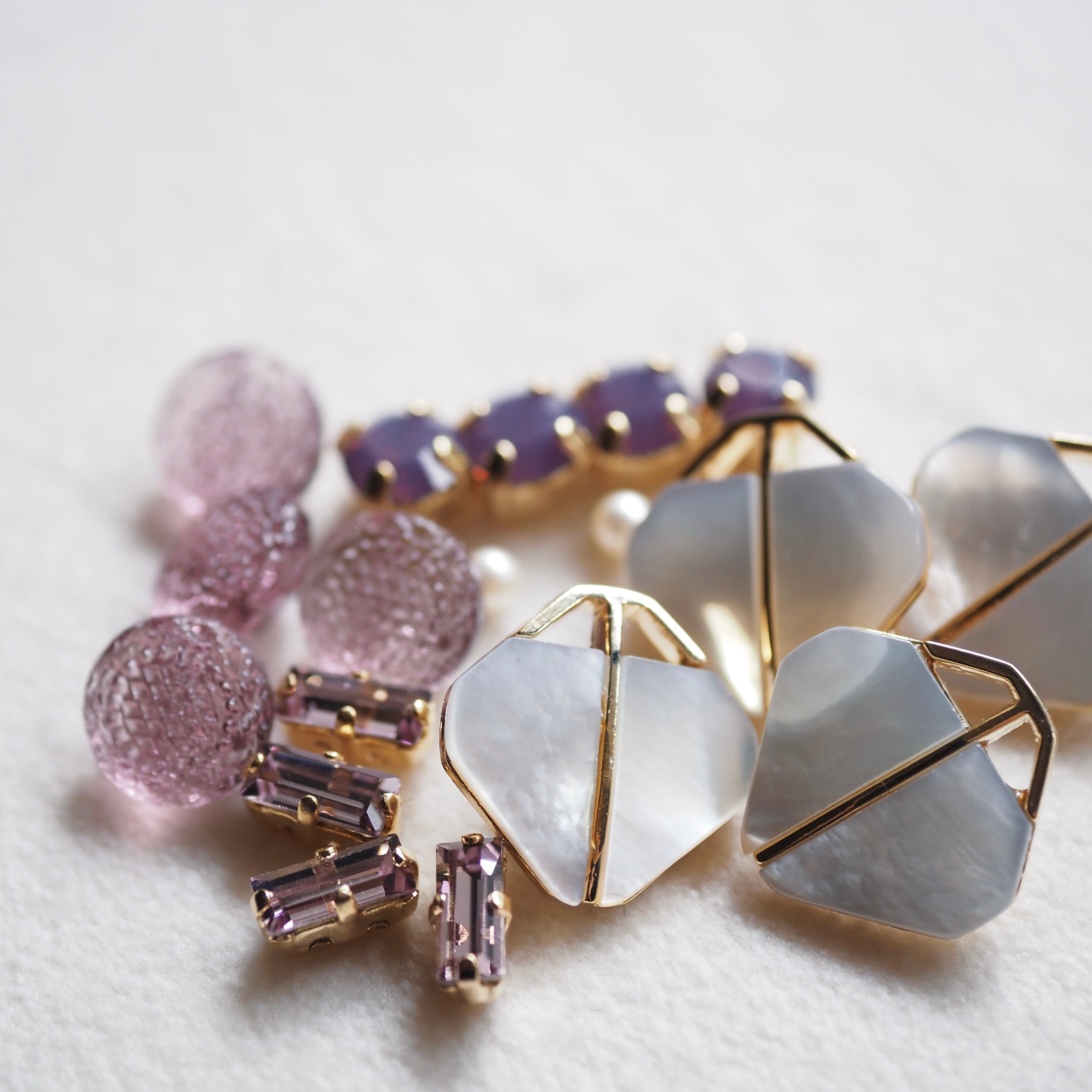 白の光とやわらかなパープルが重なる耳飾りに仕立てました。